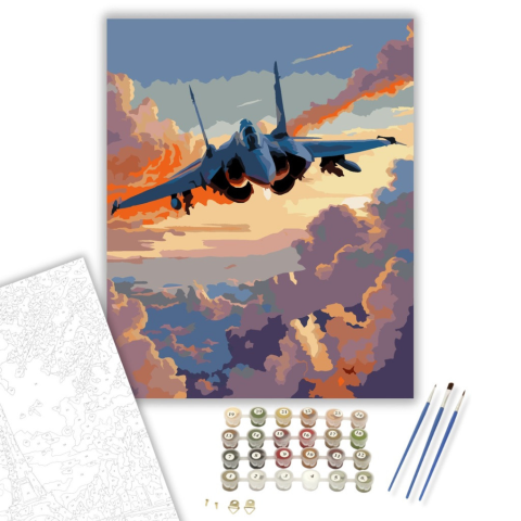 Modern Vadászgép Függőleges Felszállása - számfestő készlet – 40×50 cm (Keretre feszítve) A festmény egy modern vadászgépet ábrázol, amely függőlegesen emelkedik a szürkületi égbolt felé. Az ég narancssárga és kék árnyalatai drámai kontrasztot teremtenek,