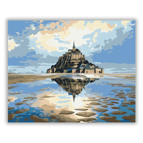 Mont Saint-Michel - számfestő készlet – 40×50 cm (Keret nélkül) A festmény a Mont Saint-Michel szigetét ábrázolja apály idején, tükröződve a nedves homokon. A kék és arany árnyalatok varázslatos, nyugodt atmoszférát teremtenek. A kép a misztikus szépséget