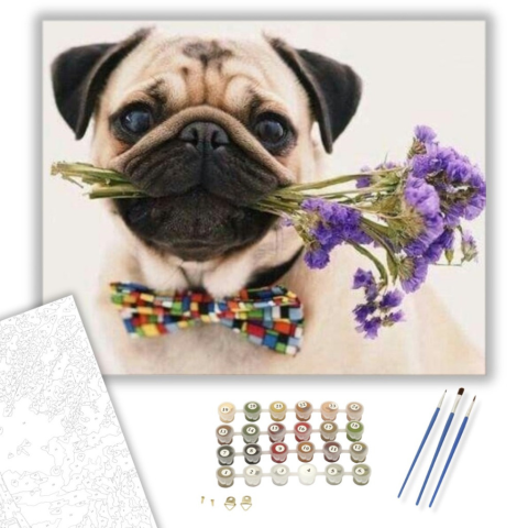 Mopszli Kutya És Virágok - számfestő készlet – 40×50 cm (Keretre feszítve) Ez a festmény egy vidám és játékos hangulatot áraszt, amely mosolyt csal az arcodra. Egy bájos mopszli, szájában virágokkal, mintha csak egy kedves üzenetet hozna neked. A háttér s