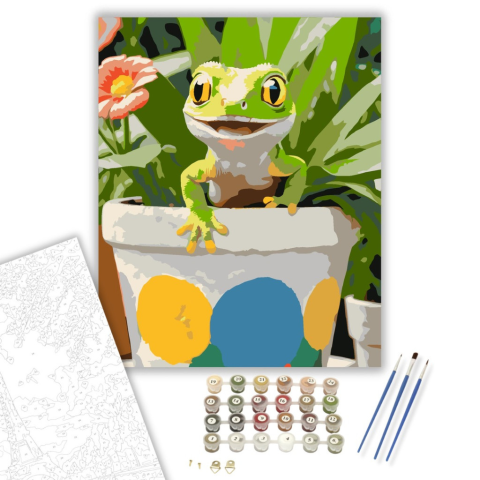1 kép Számfestő.hu Mosolygó Gekkó Virágcserépben - számfestő készlet – 40×50 cm (Keretre feszítve)