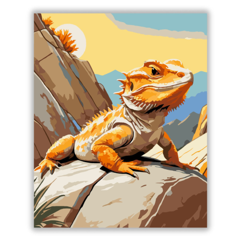 Mosolygó Szakállas Agáma Sziklán - számfestő készlet – 40×50 cm (Keret nélkül) A festmény egy sziklán pihenő szakállas agámát ábrázol, amely mintha mosolyogna a napfényben. Az élénk narancssárga és sárga árnyalatok meleg és derűs hangulatot teremtenek. A