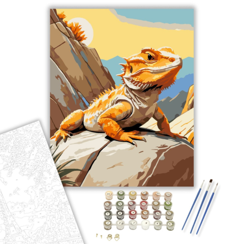Mosolygó Szakállas Agáma Sziklán - számfestő készlet – 40×50 cm (Keretre feszítve) A festmény egy sziklán pihenő szakállas agámát ábrázol, amely mintha mosolyogna a napfényben. Az élénk narancssárga és sárga árnyalatok meleg és derűs hangulatot teremtenek