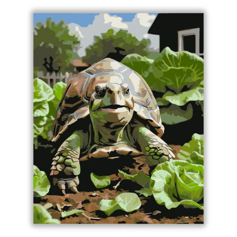 Mosolygó Teknős a Kertben - számfestő készlet – 40×50 cm (Keret nélkül) A festmény egy mosolygó teknőst ábrázol, amint friss salátalevelet majszol a kertben. A zöld levelek és a teknős barna páncélja természetes és vidám hangulatot árasztanak. A kép barát