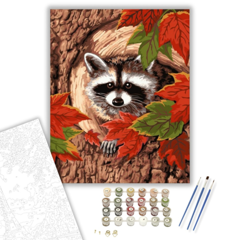 Mosómedve a fán - számfestő készlet – 40×50 cm (Keretre feszítve) A kép melegséget és kíváncsiságot áraszt, ahogy a mosómedve óvatosan kikukucskál a fa odújából. Egy mesebeli történet bontakozik ki, ahol az őszi levelek között rejtőzik egy titokzatos vilá