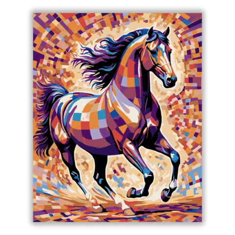 Mozaikszerű Lovas Ábrázolás - számfestő készlet – 40×50 cm (Keret nélkül) A festmény egy vágtató lovat ábrázol, melynek teste és sörénye rétegzett, absztrakt formákból áll. Az élénk magenta, borostyán, kobalt és levendula színek dinamikus és energikus han
