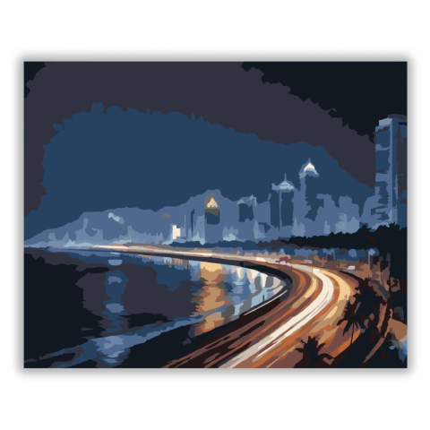 Mumbai Éjszakai Fények - számfestő készlet – 40×50 cm (Keret nélkül) A festmény Mumbai Marine Drive éjszakai látképét ábrázolja, ahol az autók fényei hosszú csíkokban húzódnak, és a magas épületek kivilágítva ragyognak. A kép sötétkék árnyalatai kontraszt