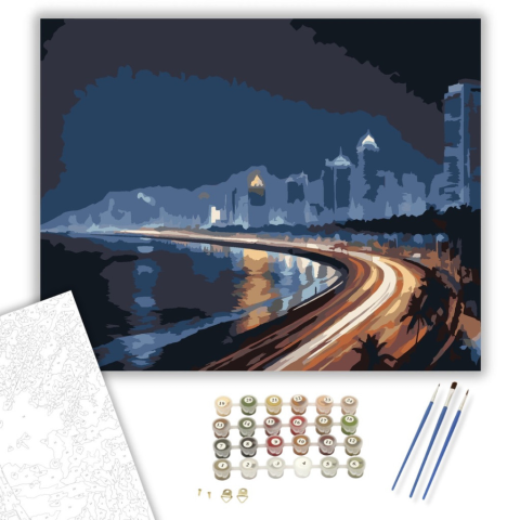 Mumbai Éjszakai Fények - számfestő készlet – 40×50 cm (Keretre feszítve) A festmény Mumbai Marine Drive éjszakai látképét ábrázolja, ahol az autók fényei hosszú csíkokban húzódnak, és a magas épületek kivilágítva ragyognak. A kép sötétkék árnyalatai kontr