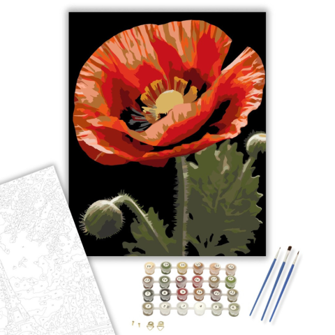 Napfényben Fürdő Piros Pipacs - számfestő készlet – 40×50 cm (Keretre feszítve) A festmény egyetlen piros pipacsot ábrázol, amelynek finom, papírvékony szirmait aranyló napfény világítja meg. Az élénkpiros szirmok és a mélyfekete középpont kontrasztja len