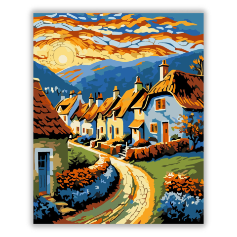 Napfényes Falu Harmóniája - számfestő készlet – 40×50 cm (Keret nélkül) A kép egy festői falut ábrázol, ahol a naplemente fényében fürdő házak sorakoznak. Az élénk színek és lendületes ecsetvonások hangsúlyozzák a táj dinamizmusát és varázsát. A kompozíci