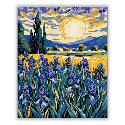 Napfényes Íriszmező - számfestő készlet – 40×50 cm (Keret nélkül) A festmény a ragyogó íriszeket és a napfényes tájat ábrázolja, Van Gogh stílusának varázslatos világában. Az élénk lila és sárga színek dinamizmusa és az expresszív ecsetvonások lenyűgöző h
