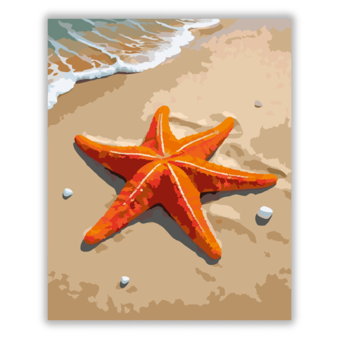 Napfényes Tengeri Csillag a Parton - számfestő készlet – 40×50 cm (Keret nélkül) A festmény egy élénk narancssárga tengeri csillagot ábrázol, amely a meleg homokban fekszik, miközben a háttérben a tenger habjai lágyan hullámoznak. Az élénk színek és a fin