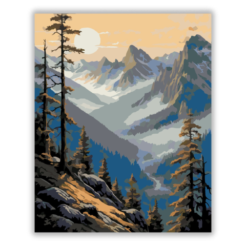 Napkelte a Hegyekben - számfestő készlet – 40×50 cm (Keret nélkül) A festmény egy ködös reggelt ábrázol a hegyekben, ahol a nap aranyló fénye bevilágítja a völgyeket. A színek meleg, aranyszínű és kék árnyalatokban játszanak, kiemelve a táj drámai szépség