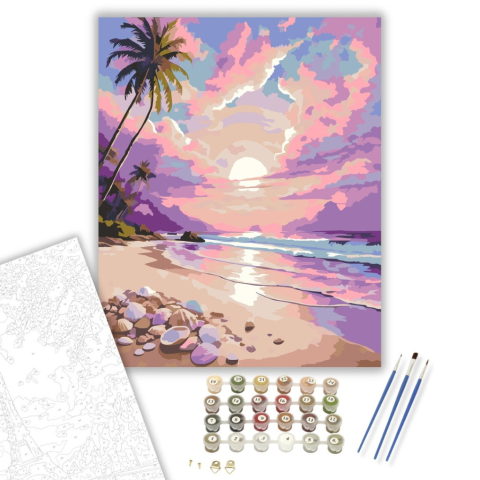Napkelte a Trópusi Tengerparton - számfestő készlet – 40×50 cm (Keretre feszítve) A festmény egy elbűvölő napkeltét ábrázol egy trópusi tengerparton, ahol az égbolt rózsaszín, lila és arany színekben pompázik. A gyengéd hullámok a puha fehér homokot simog