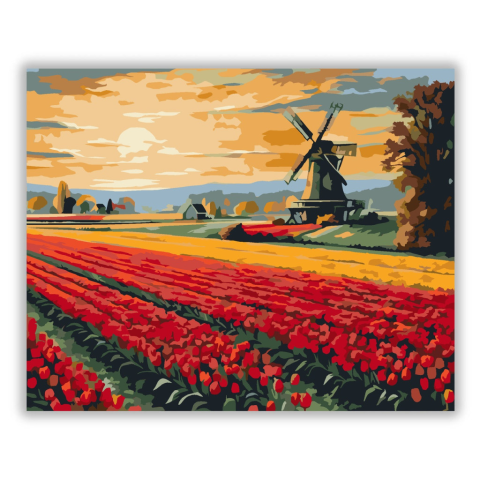 Napkelte a Tulipánmezőn Szélmalommal - számfestő készlet – 40×50 cm (Keret nélkül) A festmény egy végtelen vörös és sárga tulipánmezőt ábrázol, amelyet egy távoli szélmalom tesz különlegessé. Az aranyszínű napfény lágyan önti el a tájat, meleg, tavaszi ha