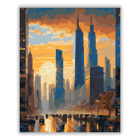 Napkelte a Város Felett - számfestő készlet – 40×50 cm (Keret nélkül) A festmény egy aranyló napkeltét ábrázol egy nyüzsgő város látképével, ahol a felhőkarcolók a reggeli ködből emelkednek ki. A nap első sugarai visszatükröződnek az üvegablakokon, meleg