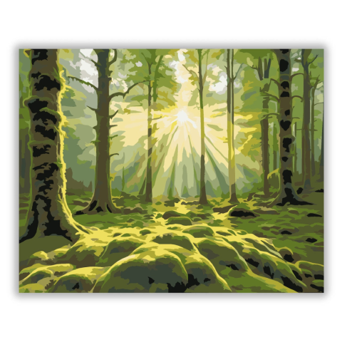 Napkelte az Erdő Mélyén - számfestő készlet – 40×50 cm (Keret nélkül) A festmény egy varázslatos napkeltét ábrázol egy sűrű erdőben, ahol az aranyló sugarak áttörnek a magas fák között. A zöld mohaszőnyegre vetülő fénycsóvák táncot járnak a harmatos földö