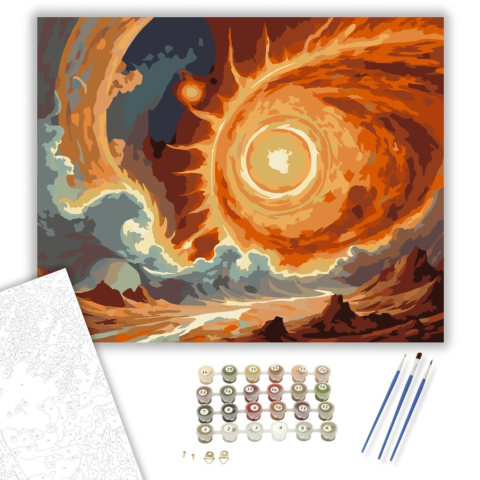 Napkitörés Mozgásban - számfestő készlet – 40×50 cm (Keretre feszítve) A festmény a Nap felszínét ábrázolja, hatalmas napkitörésekkel és plazmahurkokkal, amelyek a pezsgő felszín fölé emelkednek. A narancs, vörös és sárga árnyalatok dinamikus és energikus