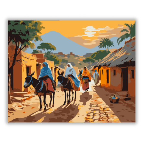Naplemente a Nílus Mentén - számfestő készlet – 40×50 cm (Keret nélkül) A festmény egy békés nílusi falut ábrázol, ahol nők szamarakon lovagolnak, és mások kosarakat visznek a fejükön. A jelenetet a naplemente meleg, arany színei uralják, amelyek nyugodt