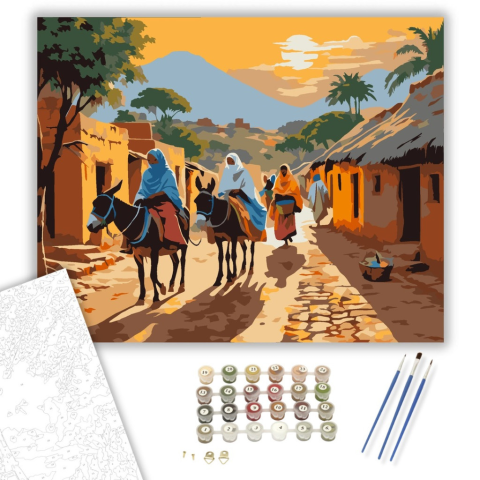 Naplemente a Nílus Mentén - számfestő készlet – 40×50 cm (Keretre feszítve) A festmény egy békés nílusi falut ábrázol, ahol nők szamarakon lovagolnak, és mások kosarakat visznek a fejükön. A jelenetet a naplemente meleg, arany színei uralják, amelyek nyug