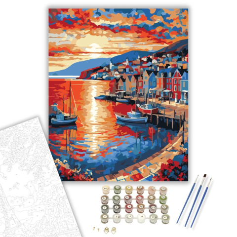 Naplemente a Tengerparti Városban - számfestő készlet – 40×50 cm (Keretre feszítve) A festmény egy színes tengerparti várost ábrázol naplementekor, ahol a meleg fények az ablakokból áradnak, és a kikötő víztükrén kaleidoszkópszerűen tükröződnek a vörös és