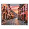Naplemente a Történelmi Városban - számfestő készlet – 40×50 cm (Keret nélkül) A festmény egy álomszerű naplementét ábrázol egy történelmi európai városban, ahol a meleg rózsaszín és narancssárga árnyalatok lágyan világítják meg a macskaköves utcákat és a