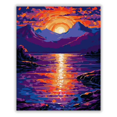 Naplemente Hegyi Tó Felett - számfestő készlet – 40×50 cm (Keret nélkül) A festmény egy hegyi tájat ábrázol, ahol a naplemente fénye tükröződik a tó felszínén. A kép domináns színei az élénk narancs, lila és kék árnyalatok, amelyek kontrasztos hatást kelt