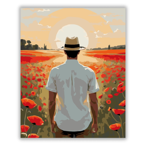 Naplemente Pipacsmező - számfestő készlet – 40×50 cm (Keret nélkül) A festmény egy fiatal férfit ábrázol, amint egy pipacsmezőn áll, fehér ingben és szalmakalapban, a naplemente aranyló fényében. Az élénkpiros pipacsok és a lenyugvó nap narancsos árnyalat