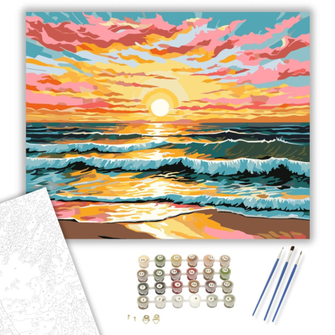 Naplemente Tengerparti Harmóniája - számfestő készlet – 40×50 cm (Keretre feszítve) A festmény a naplemente tengerparti látványát tárja elénk, dinamikus ecsetvonásokkal és élénk színekkel. A rózsaszín és narancssárga árnyalatok kontrasztja, valamint a hul