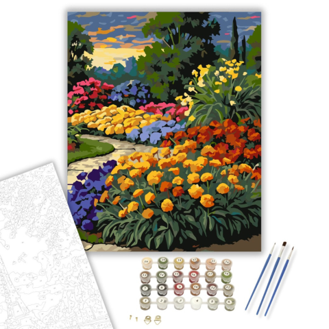 Naplemente Virágoskert Harmóniája - számfestő készlet – 40×50 cm (Keretre feszítve) A festmény egy gyönyörű virágoskertet ábrázol, amely a naplemente varázslatos fényében tündököl. Az élénk színek és lendületes ecsetvonások kiemelik a virágok szépségét, h