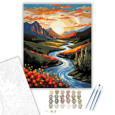 Naplemente Völgy Szimfóniája - számfestő készlet – 40×50 cm (Keretre feszítve) A festmény egy kanyargó folyót ábrázol, amely a naplemente fényében ragyogó hegyek között halad. Az élénk narancs és piros színek, valamint a dinamikus ecsetvonások erőteljes v