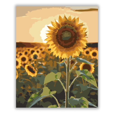 Naplementében Álló Napraforgó - számfestő készlet – 40×50 cm (Keret nélkül) A festmény egy magányos napraforgót ábrázol, amely büszkén áll a naplemente aranyszínű fényeiben. A sárga szirmok ragyognak a háttérben elterülő mező felett, meleg és békés hangul