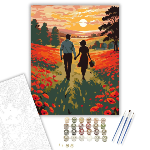 Naplementés Pipacsmező Szerelmespárral - számfestő készlet – 40×50 cm (Keretre feszítve) A festmény egy szerelmespárt ábrázol, akik kéz a kézben sétálnak egy pipacsokkal teli mezőn naplementekor. A kompozíció a naplemente aranyló fényében fürdőző élénkpir