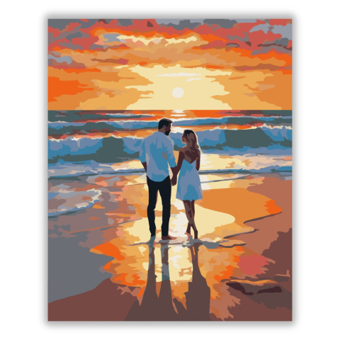 Naplementés Tengerparti Kérés - számfestő készlet – 40×50 cm (Keret nélkül) A festmény egy romantikus jelenetet ábrázol, ahol egy pár áll a homokban, miközben a naplementében gyönyörködnek. A meleg narancs és arany színek tükröződnek a hullámokban, varázs