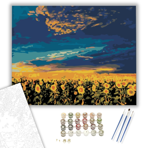 Napraforgó Föld - számfestő készlet – 40×50 cm (Keretre feszítve) A festmény egy varázslatos naplementét ábrázol, amely a nézőt egy nyugodt, békés világba repíti. A napraforgók tengerén átívelő fények és árnyékok saját történetüket mesélik el a természet