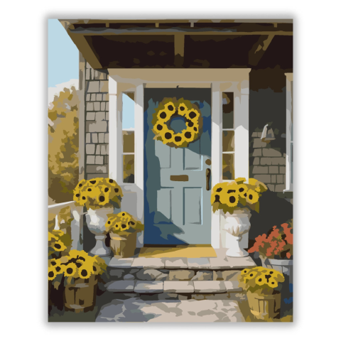 Napraforgó Koszorú a Tornácon - számfestő készlet – 40×50 cm (Keret nélkül) A festmény egy bájos parasztház tornácát ábrázolja, napraforgó koszorúval az ajtón és fa ládákban elhelyezett élénksárga virágokkal. A színek melegséget és vidámságot sugároznak,
