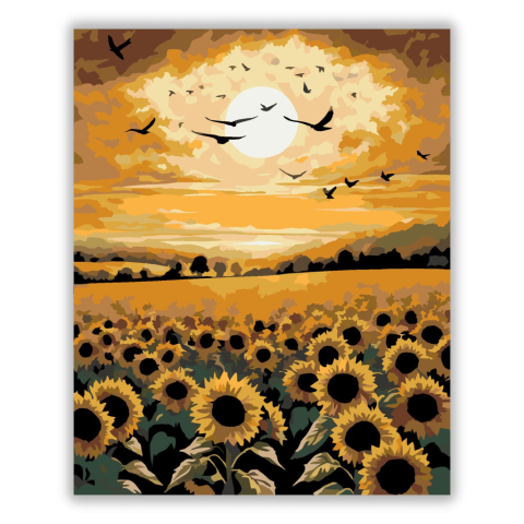 Napraforgó Mező és Madarak - számfestő készlet – 40×50 cm (Keret nélkül) A festmény egy napraforgó mezőt ábrázol, mely felett madarak repülnek a napfelkeltében. Az aranyló égbolt és a sötét sziluettek kontrasztja lenyűgöző látványt nyújt. A kép a természe