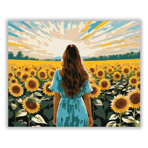 Napraforgó Mező Nővel - számfestő készlet – 40×50 cm (Keret nélkül) A festmény egy hosszú hajú, fiatal nőt ábrázol, aki egy napraforgó mezőben áll, háttal a nézőnek. Az élénksárga napraforgók és a kék ég kontrasztja derűs, nyári hangulatot teremt. A kép a