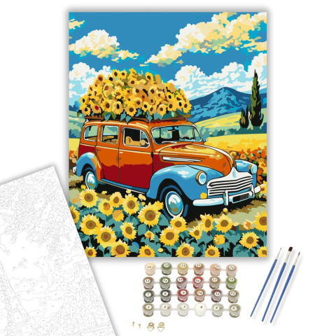 Napraforgó Utazás Harmóniája - számfestő készlet – 40×50 cm (Keretre feszítve) Ez a festmény egy vintage autót ábrázol, amelyet napraforgók borítanak, egy idilli vidéki tájban. Az élénk sárga és kék színek kombinációja, valamint a lendületes ecsetkezelés