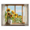 Napraforgók az Ablakban - számfestő készlet – 40×50 cm (Keret nélkül) A festmény egy rusztikus fa ablakkeretet ábrázol, amelyet napraforgók díszítenek, miközben egy lágy nyári szellő mozgatja a függönyöket. Az élénksárga szirmok és a zöld táj harmóniája i