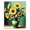 Napraforgók Ragyogása - számfestő készlet – 40×50 cm (Keret nélkül) A kép egy vázában elhelyezett napraforgókat ábrázol, amelyek a természet energiáját és szépségét sugározzák. A gazdag sárga és zöld árnyalatok dinamikus ecsetkezeléssel párosulnak, erőtel