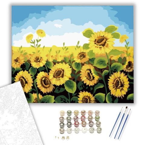 Napraforgók - számfestő készlet – 40×50 cm (Keretre feszítve) A festmény meleg, napfényes hangulata azonnal magával ragadja a nézőt. Egy nyári mező története bontakozik ki, ahol a napraforgók büszkén emelik arcukat a nap felé. Az élénk sárga és zöld árnya