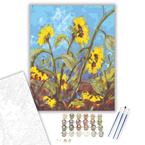 Napraforgók - számfestő készlet – 40×50 cm (Keretre feszítve) A napraforgók ragyogó sárga szirmai melegséget és boldogságot árasztanak, mint a nyári napfény. A kép egy csendes mezőt idéz, ahol a természet szépsége és harmóniája uralkodik. A háttér kék árn