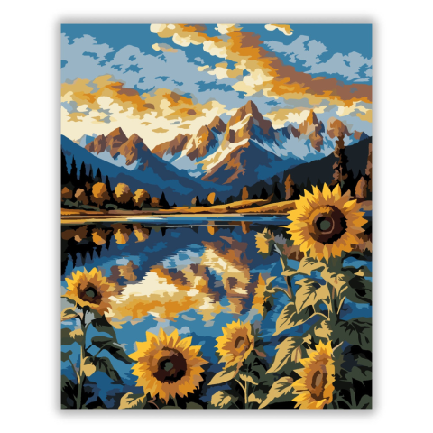 Napraforgómező és Hófödte Hegyek - számfestő készlet – 40×50 cm (Keret nélkül) A festmény egy aranyló napraforgómezőt ábrázol, háttérben hóval borított hegycsúcsokkal és egy tükröződő tóval. A kép meleg sárga és hűvös kék árnyalatokkal játszik, megragadva