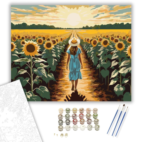 Napraforgómező Nyári Sétával - számfestő készlet – 40×50 cm (Keretre feszítve) A festmény egy végtelen napraforgómezőt ábrázol, ahol minden virág a nap felé fordul, és egy szalmakalapos fiatal lány sétál a magas szárak között. A kompozíció élénk sárga, zö