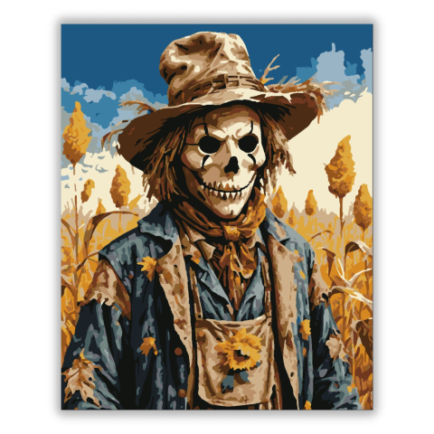 Napraforgós madárijesztő - számfestő készlet – 40×50 cm (Keret nélkül) Ez a festmény egy barátságos, napraforgókkal díszített madárijesztőt ábrázol, amely tökéletesen idézi meg az őszi vidéki hangulatot. A háttérben látható aranyszínű mezők és kék ég kont
