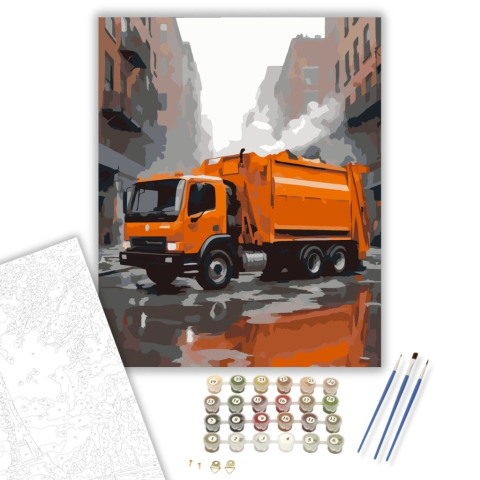 1 kép Számfestő.hu Narancssárga Kukásautó Városi Utcán - számfestő készlet – 40×50 cm (Keretre feszítve)