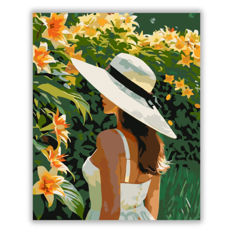 Narancssárga Liliomok Kertje - számfestő készlet – 40×50 cm (Keret nélkül) A festmény egy széles karimájú kalapot viselő nőt ábrázol, ahogy egy narancssárga liliomokkal teli kertben áll. A kontrasztos színek és az árnyékok játékossága nyugodt, mégis titok