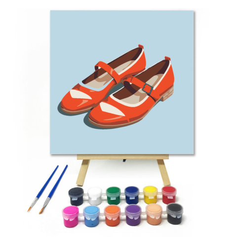 Narancssárga nyári cipellők - gyerek számfestő készlet – 20×20 cm (Keretre feszítve) Itt egy csodás kép két narancssárga cipellőről, amelyek készen állnak, hogy elrepítsenek egy vidám nyári kalandra! A ragyogó színek és barátságos formák biztosan mosolyt