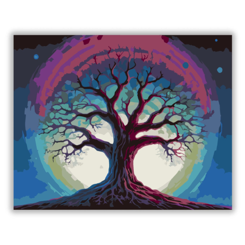 Neon Ágak és Kozmikus Színek - számfestő készlet – 40×50 cm (Keret nélkül) A kép egy lebegő fát ábrázol, melynek törzse elektromos kék villámvonalakból áll, koronáját pedig neon pöttyök alkotják. A háttérben élénk színek, mint a piros, lila és zöld, alkot