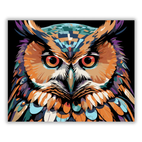 Neon Bagoly Élénk Textúrákkal - számfestő készlet – 40×50 cm (Keret nélkül) A festmény egy neon bagoly portréját ábrázolja, amelynek tollai grafikus foltokban helyezkednek el, élénk smaragdzöld, narancs, levendula és türkiz színekben. A kompozíció vibráló